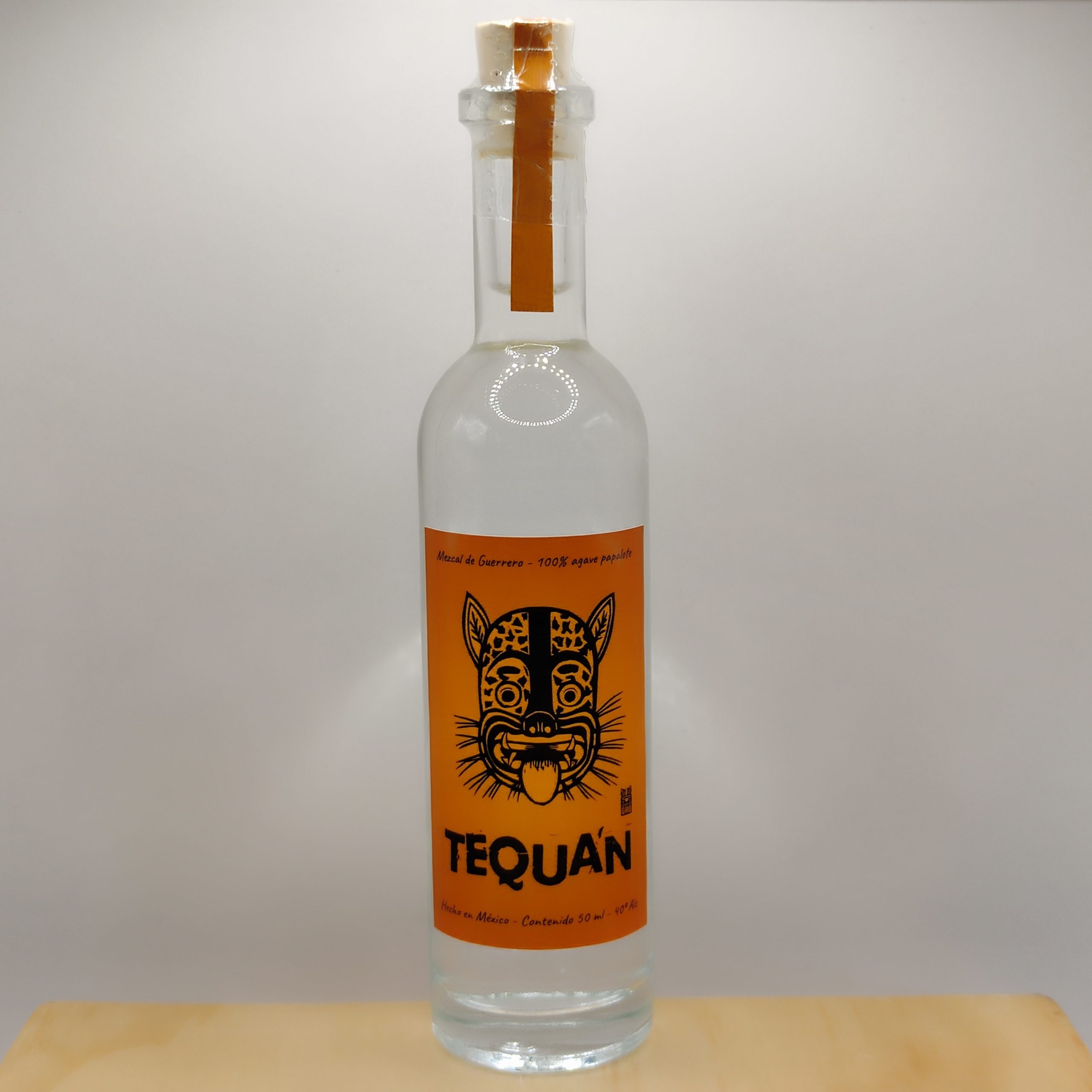 Mezcal Tequan de 50 ml en botella de vidrio con 40% de alcohol, elaborado con agave papalote en Guerrero. Artesanal y altamente coleccionable.