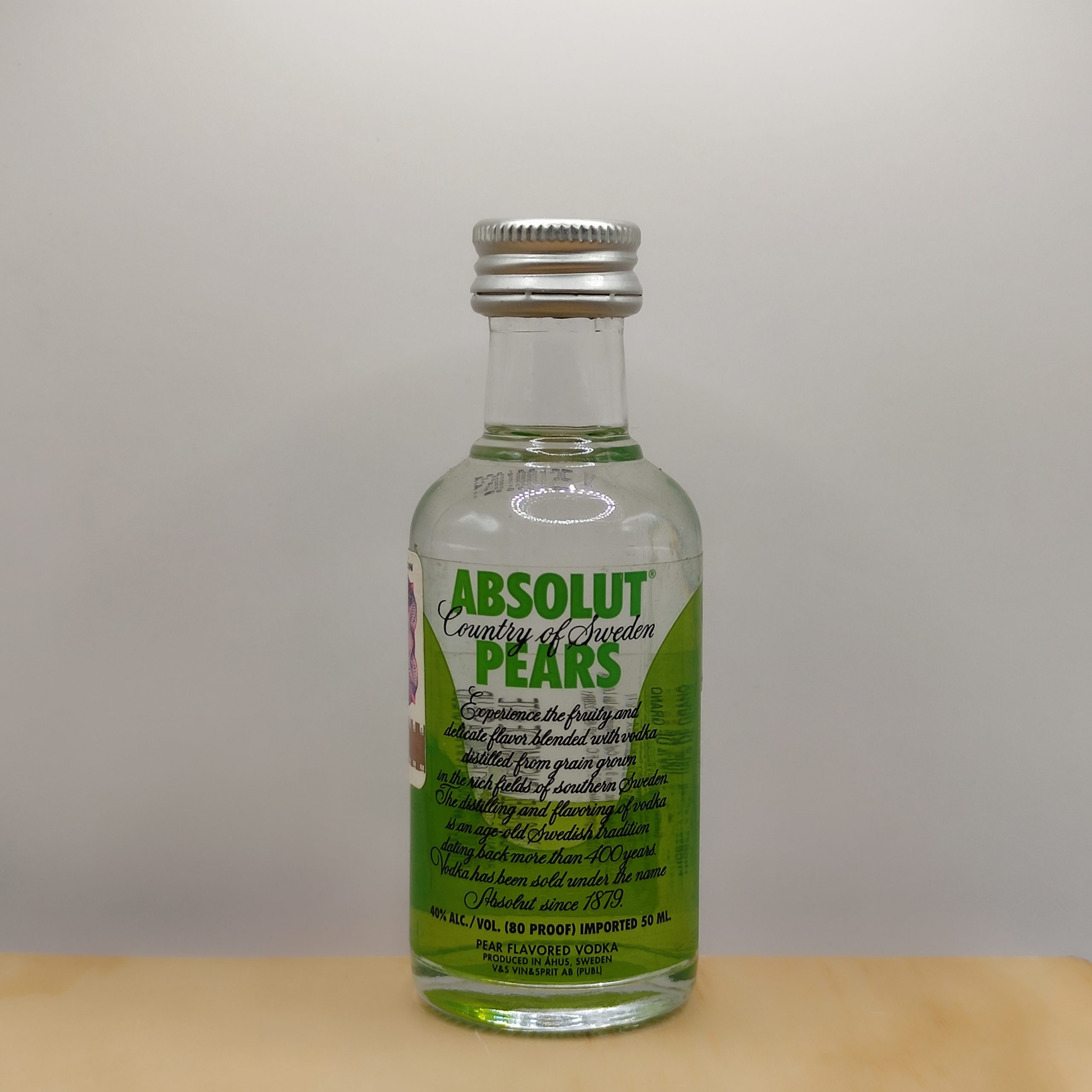 Vodka Absolut Pears versión 2009 de 50 ml en botella de vidrio con 40% de alcohol. Edición especial, frutal y altamente coleccionable.